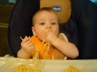 I made spaghetti for dinner last week and it seemed like a great opportunity to let Jackson explore a new texture. The stickiness bothered him at first (and the fact that JD kept putting it on his head). He kept shaking his hands to try and get it off. He isn't ready to eat it yet but it sure was fun to play with. Here are some pictures of Jackson with mangoes on his face and spaghetti stuck to his hands...thank goodness it was bath night!